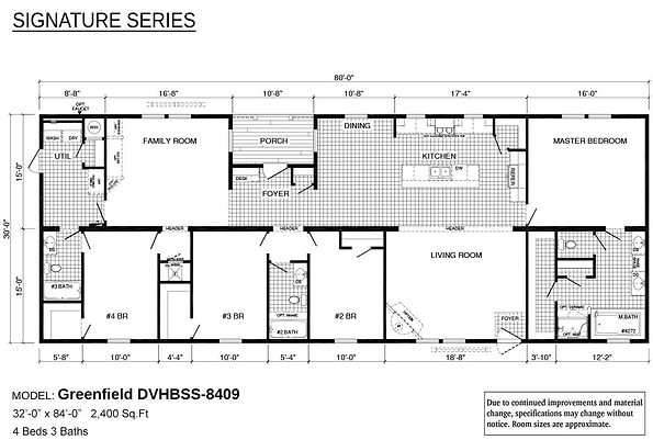 Greenfield DVHBSS-8409 ( Serial#11693) / Expansive four bedroom/three bath home features spacious living room open to beautiful island kitchen, large separate family room and foyer entrance to covered rear porch, ideal for casual dining and relaxation.